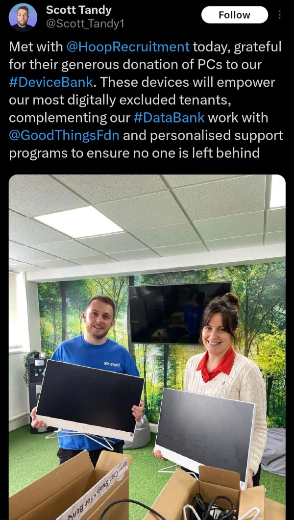 At Hoop, we believe in empowering our team to make a difference, not only collectively but also as individuals. To support this, every employee receives a paid volunteer day each year to dedicate to a cause close to their heart. This initiative allows our team to contribute to meaningful work in our local communities, from volunteering at Cardiff Dogs Home, where they’ve spent time caring for and walking rescue dogs, to supporting sustainable projects at Re:Make Newport, which promotes upcycling and environmental awareness.
